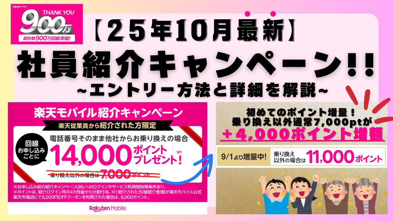 楽天モバイル紹介キャンペーン。楽天の従業員から紹介された方限定で、電話番号そのまま他社から乗り換えの場合は14,000ポイント、乗り換え以外の場合は(9/1より増量中!)11,000ポイントを進呈します!