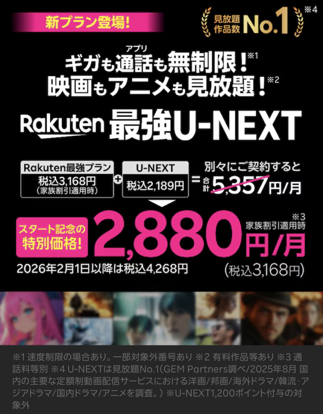 Rakuten最強U-NEXTはRakuten最強プランにU-NEXT見放題がついたおトクなプラン!さらに今ならスタート記念の特別価格で月額3,168円(税込)でご利用いただけます!※2026年2月1日以降は4,268円(税込)